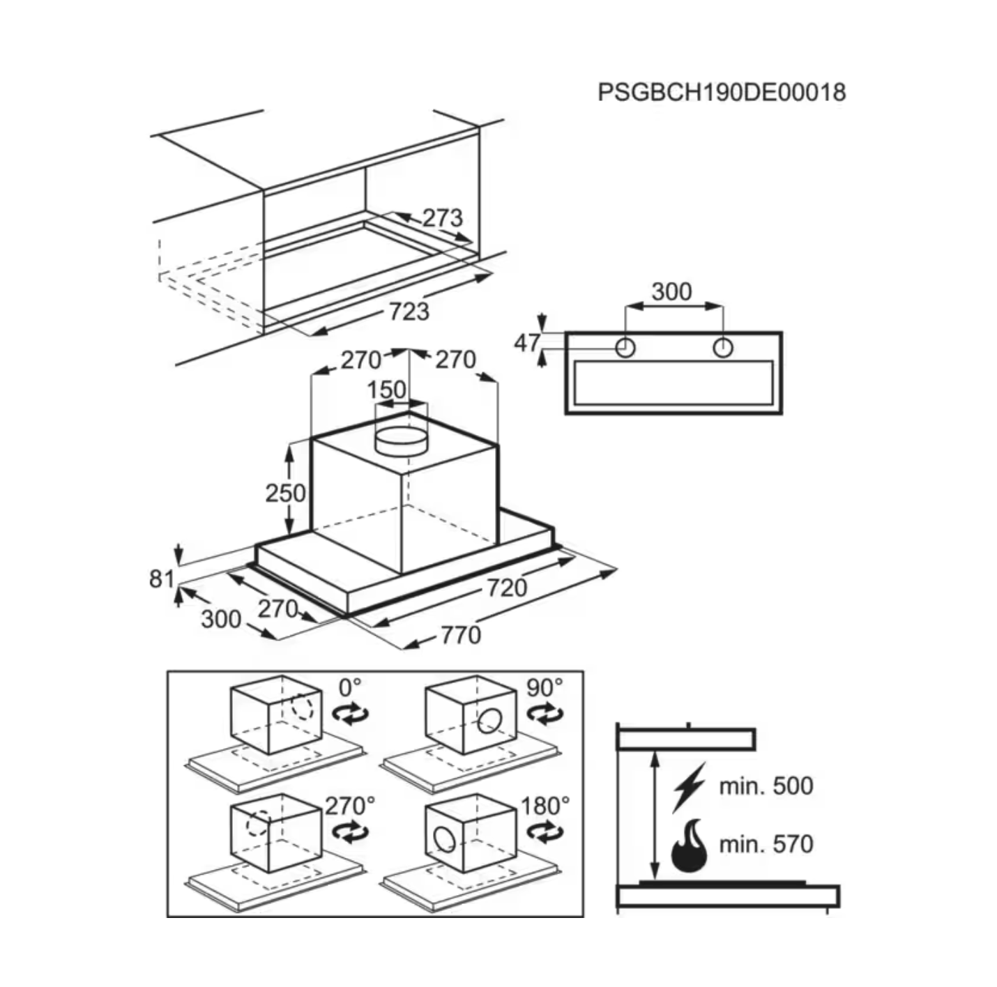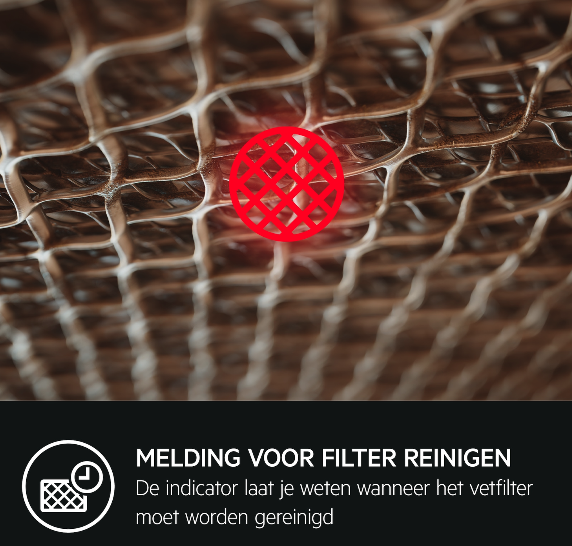 Uitgerust met vetfilter. Bij recirculatie moet er ook een koolstoffilter in de dampkap om geurtjes te verwijderen, verkrijgbaar als accessoire.