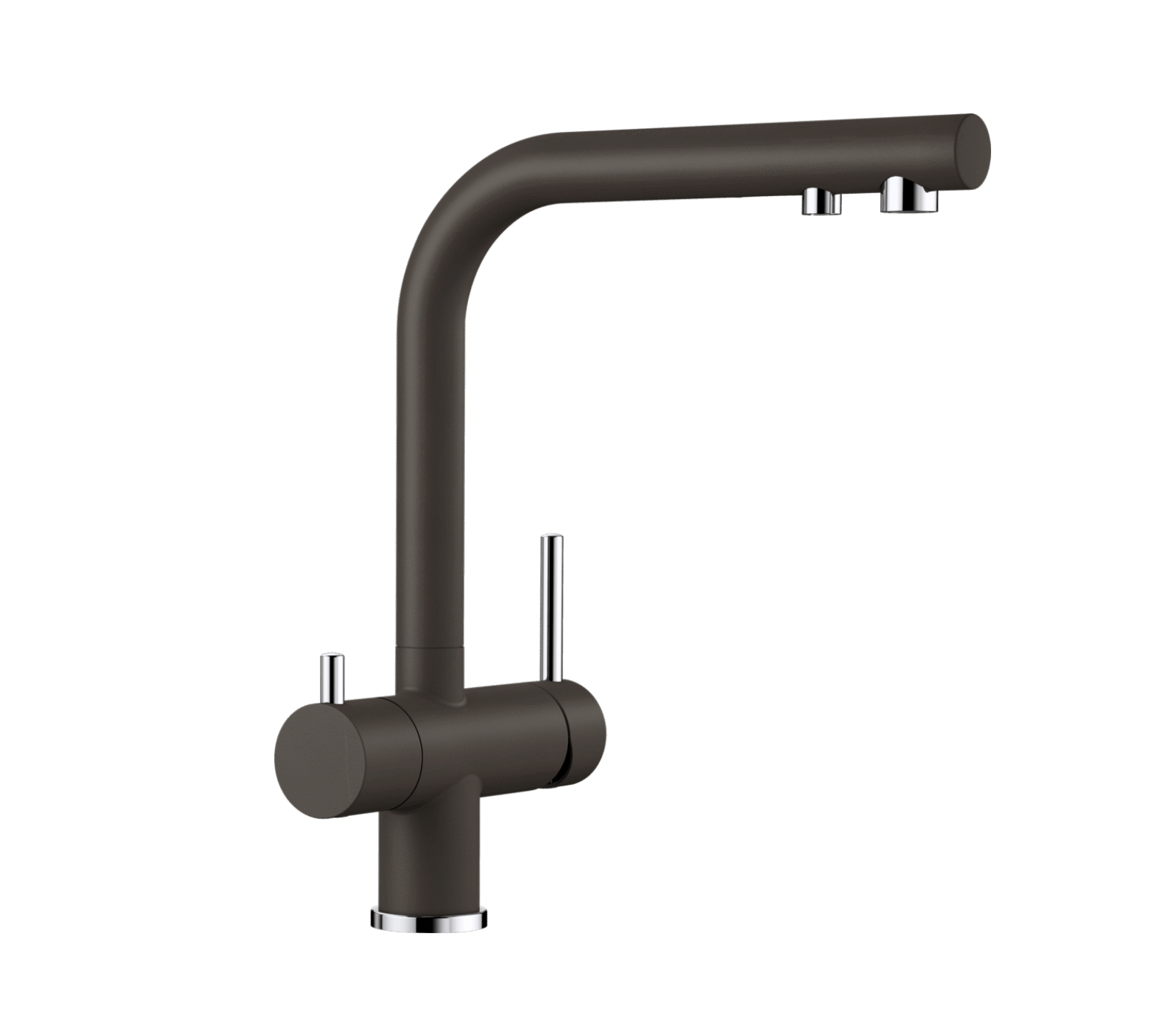 Comfortabele 3-in-1 mengkraan met bedieningshendel voor koud en warm water aan rechterzijde en bedieningshendel voor gefilterd water aan linkerzijde