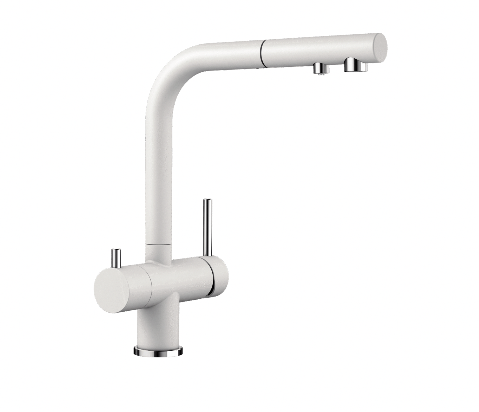 Afzonderlijke bedieningshendels: hendel rechts voor koud en warm water en draaihendel links voor gefilterd water