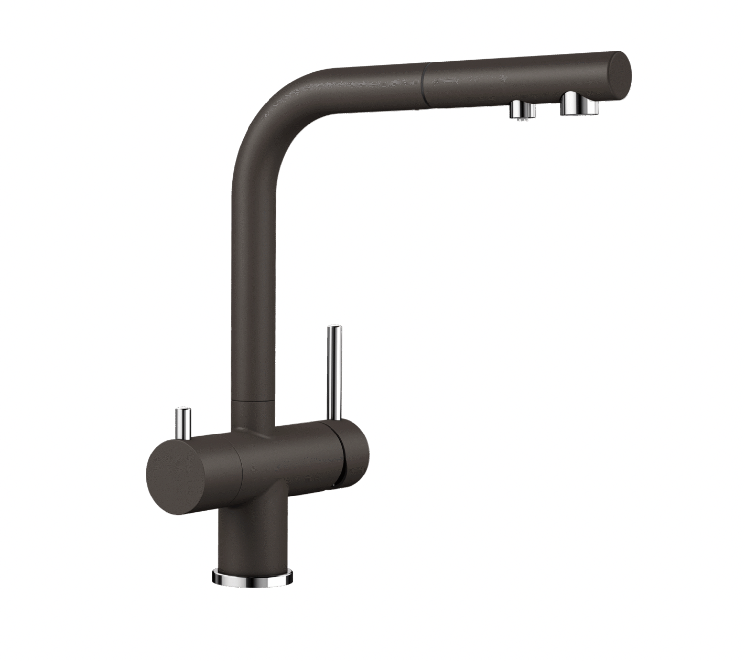 Afzonderlijke bedieningshendels: hendel rechts voor koud en warm water en draaihendel links voor gefilterd water