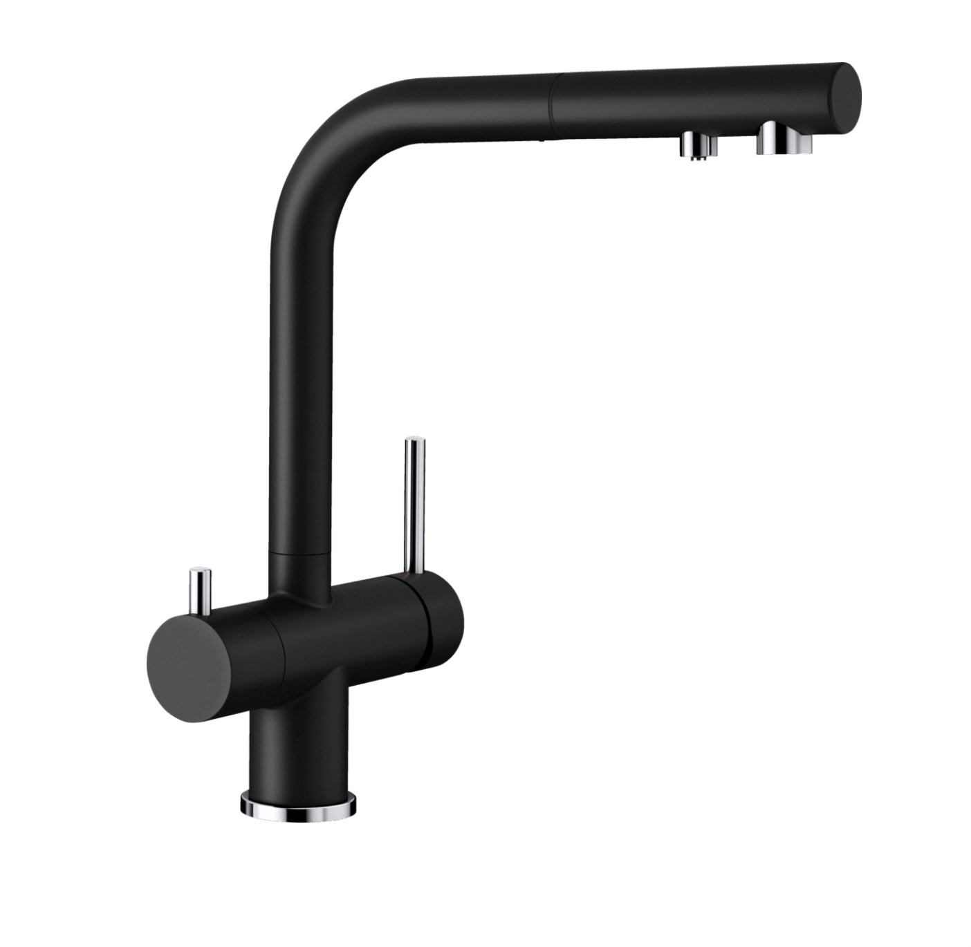 Afzonderlijke bedieningshendels: hendel rechts voor koud en warm water en draaihendel links voor gefilterd water