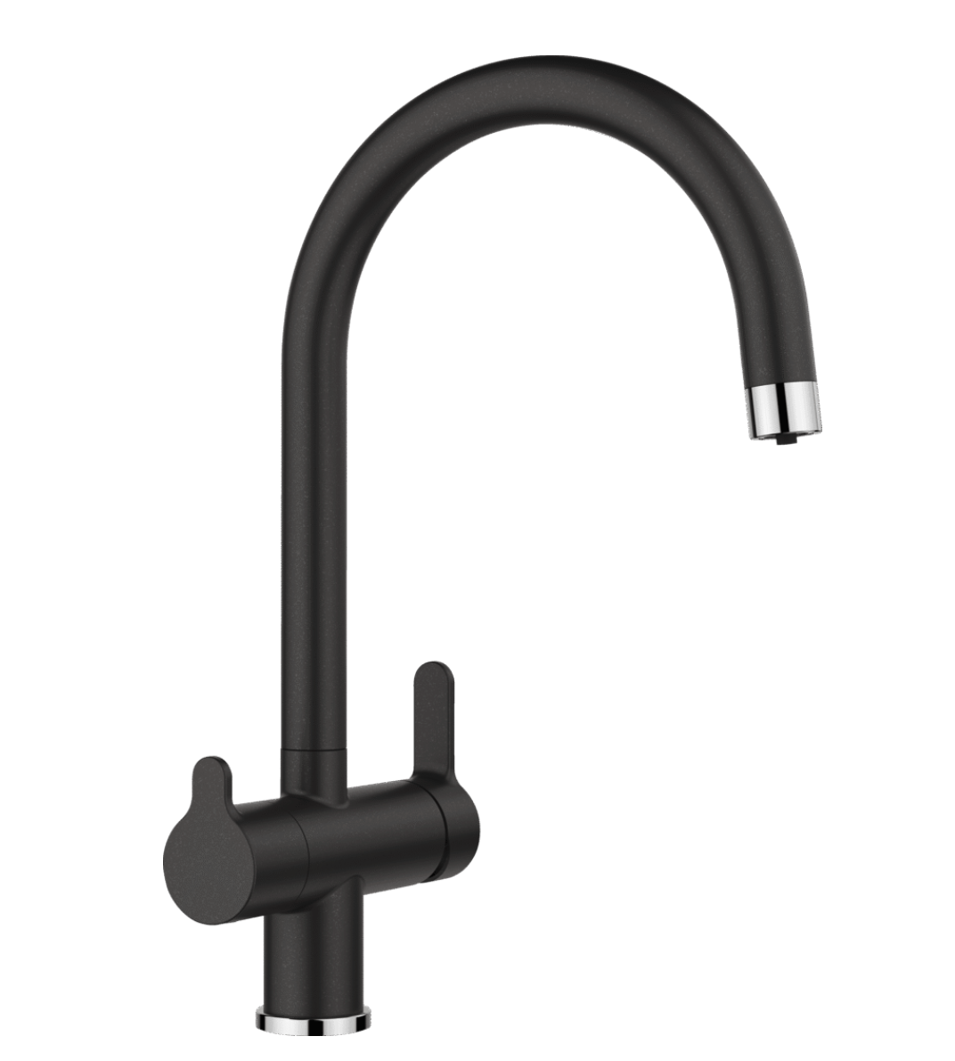 Comfortabele 3-in-1-mengkraan met bedieningshendel voor koud en warm water aan rechterzijde en bedieningshendel voor gefilterd water aan linkerzijde
