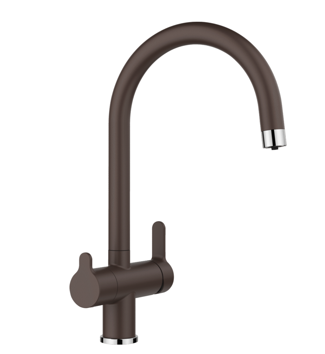 Comfortabele 3-in-1-mengkraan met bedieningshendel voor koud en warm water aan rechterzijde en bedieningshendel voor gefilterd water aan linkerzijde