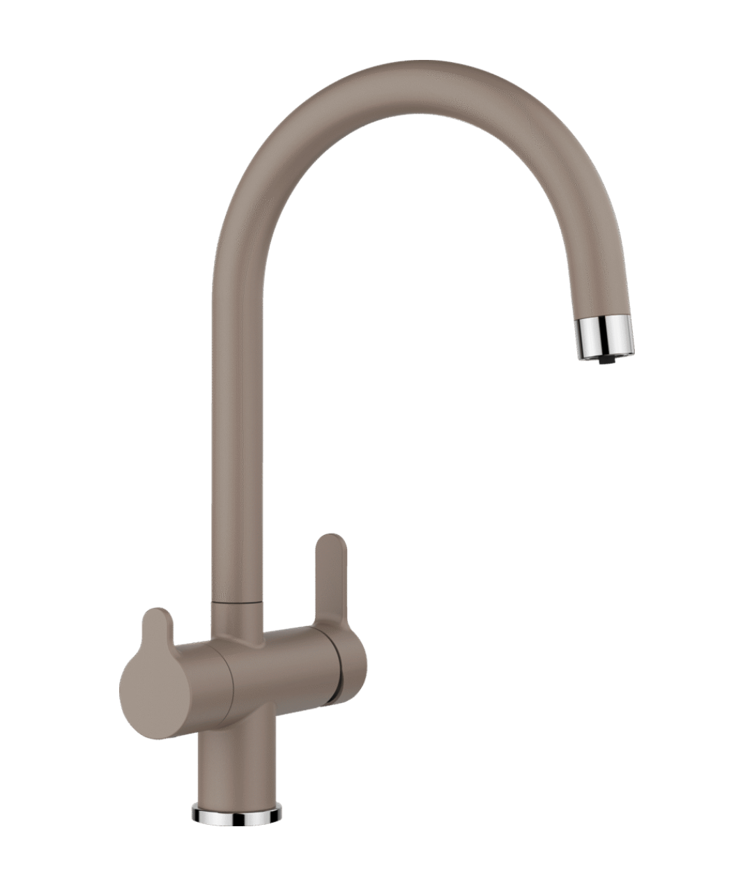 Comfortabele 3-in-1-mengkraan met bedieningshendel voor koud en warm water aan rechterzijde en bedieningshendel voor gefilterd water aan linkerzijde