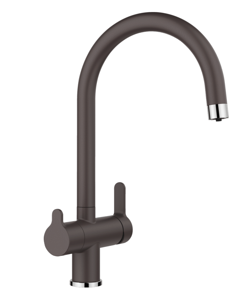 Comfortabele 3-in-1-mengkraan met bedieningshendel voor koud en warm water aan rechterzijde en bedieningshendel voor gefilterd water aan linkerzijde