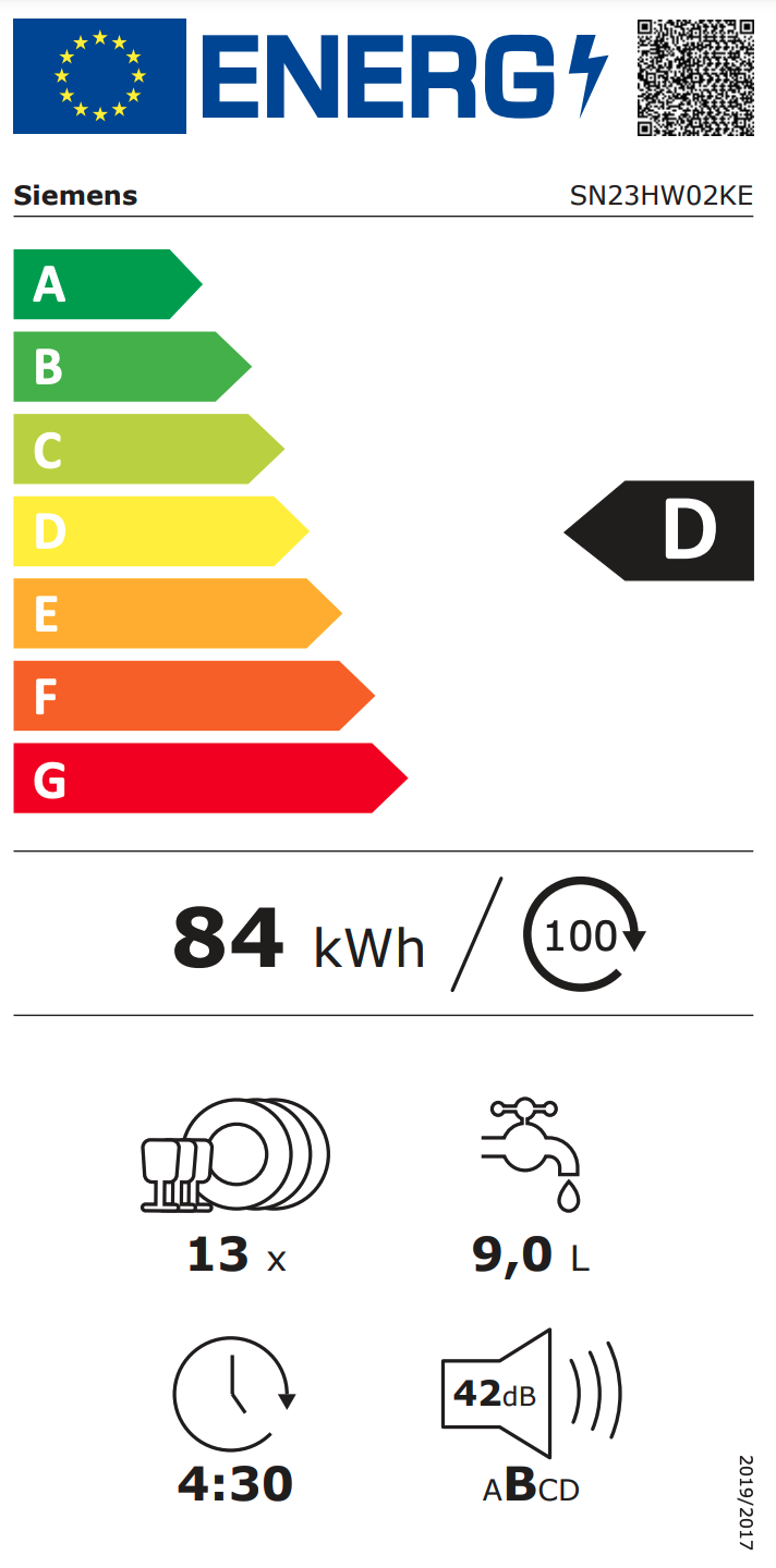 Energie²/Waterverbruik³: 84 kWu / 9 liter